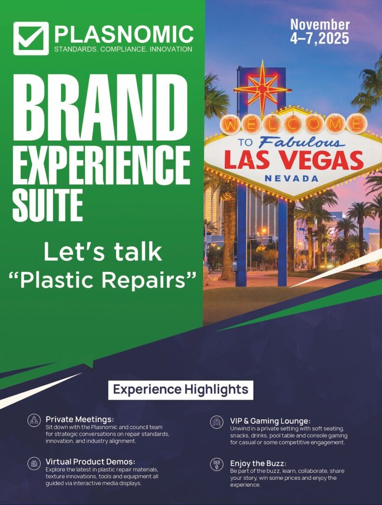 Join us at the Plasnomic Brand Experience suite at The Venetian Las Vegas November 3–7, 2025, during SEMA Week. We’re bringing together industry leaders and experts to delve into all aspects of “Plastic Repairs.” This exclusive event offers private meetings, product showcases, engaging digital demonstrations, and a relaxed VIP & Gaming Lounge, fostering the perfect environment for networking, collaboration, and delving into the future of repair standards, compliance, and innovation. Spaces are limited, so act quickly! If you’re keen on connecting with our team or uncovering more about the future of Plastic Repair in the collision industry and Plasnomic’s initiatives, don’t hesitate to drop us a direct message to secure your slot.